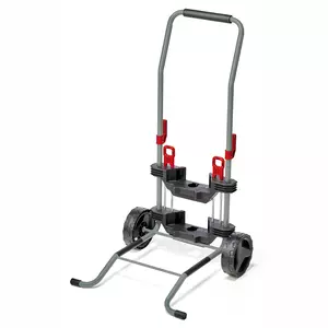 Hose reel accessory – The Original Einhell hose and transport cart is compatible with the Einhell cordless hose reels GE-HR 18/30 Li, GE-HR 18/30-1, GE-HR 18/30 WH Li and GE-HR 18/30-1 WH. A wall-mounted hose reel can be easily converted into a hose cart with no tools required. With a large cargo surface of 28 x 34 cm and a maximum load of 50 kg, the trolley finds many uses. In addition to transporting a hose reel, it can also be used to carry potted plants, beverage crates and other heavy and unwieldy items. A 75-litre garden waste sack is included, and can be easily attached to the cart thanks to the hook-and-loop fastener. The trolley comes with two ground stakes which can be used to anchor it on the lawn or to the soil. The supplied 1.5 m long (1/2") extension hose with double coupling increases the range of movement around a water source. This hose can be temporarily stored on 2 hooks for transport.